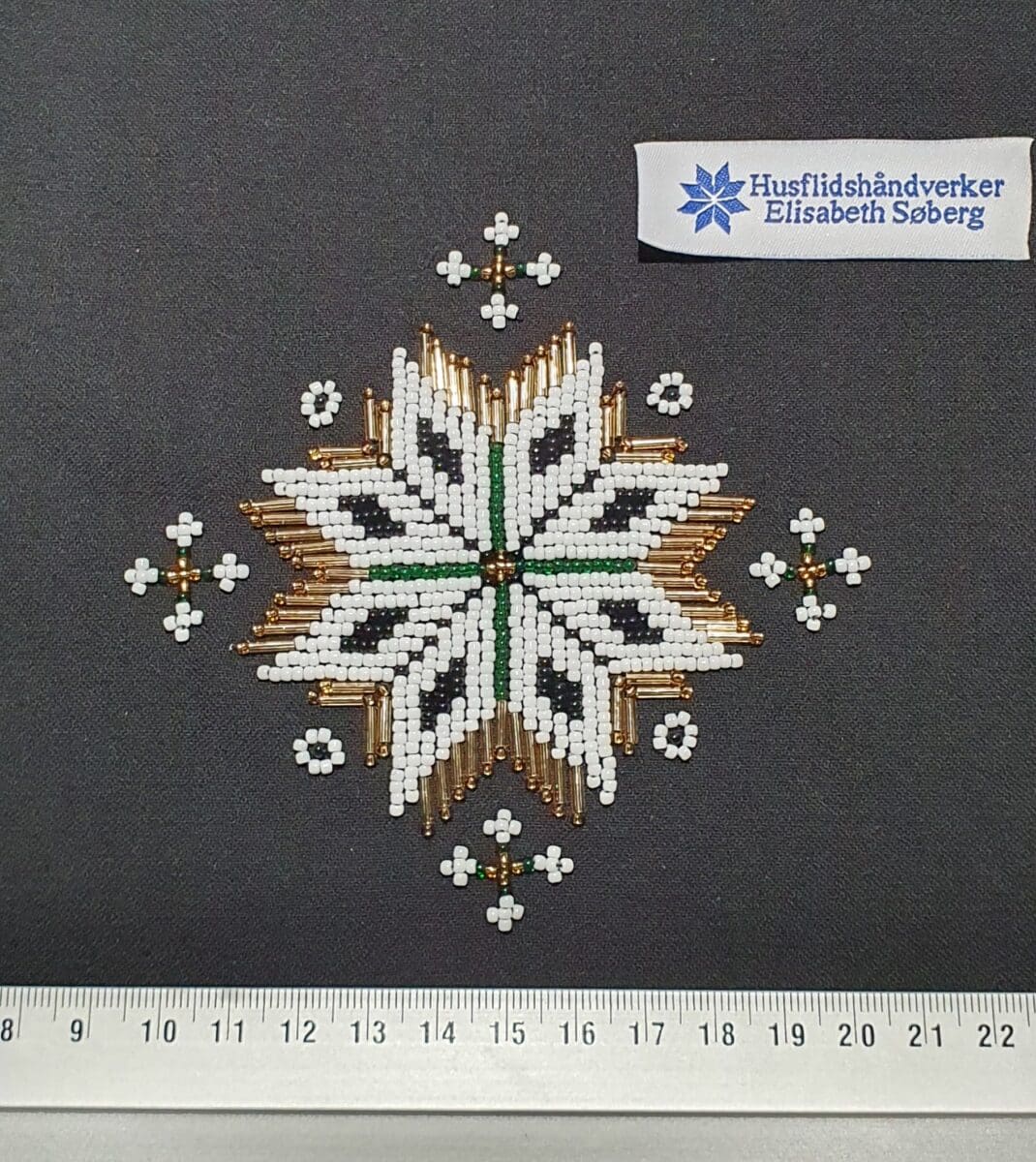 Brodert i fargene hvit 81, sort 23980, gull 17050 og grønn 50060
