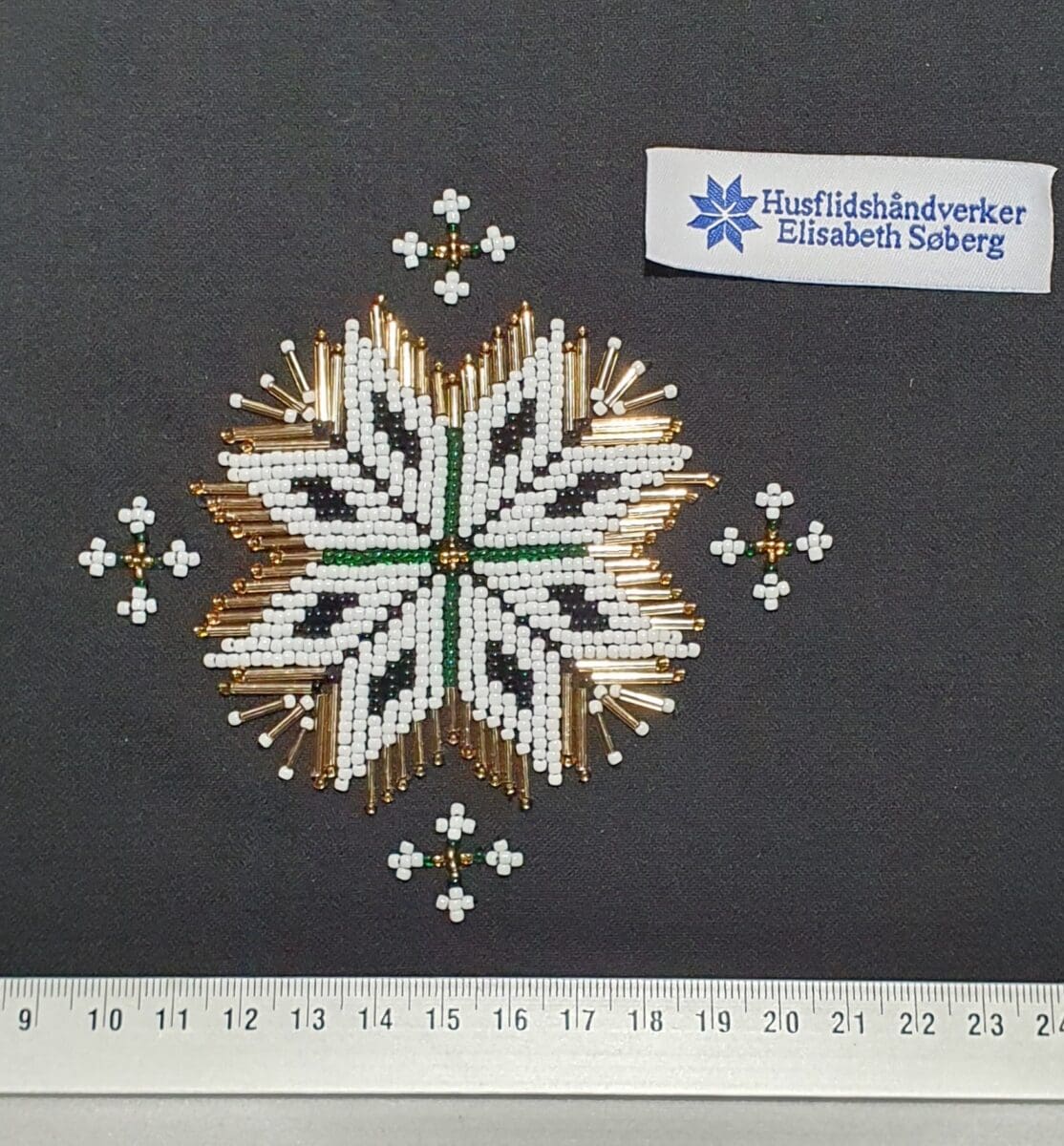 Brodert i fargene hvit 81, sort 23980, gull 17050 og grønn 50060